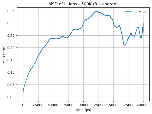 I am uncertain why when I do a msd calculation with gromacs I am obtaining the following strange results: I would appreciate a lot if someone could help me out please. Thank you! For example, the command I am using is gmx msd -f t550_prodrun.xtc -s t550_prodrun.tpr -o msd-Li.xvg